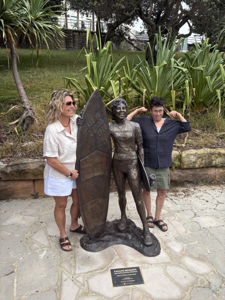 Bondi, Sydney, November 21 – On a windswept afternoon in Bondi, the beach that shaped her, 1993 World Champion Pauline Menczer – alongside friends, family and fans in the Bondi Pavilion – celebrated the unveiling of a life-size bronze version of her younger self above the lineup.
